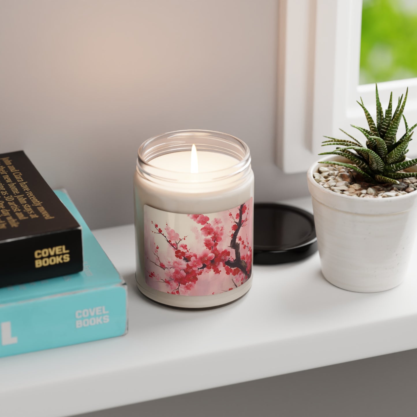 Artistic Floral Elegance: Scented Soy Candle Showcasing Exquisite Cherry Blossom Renderings