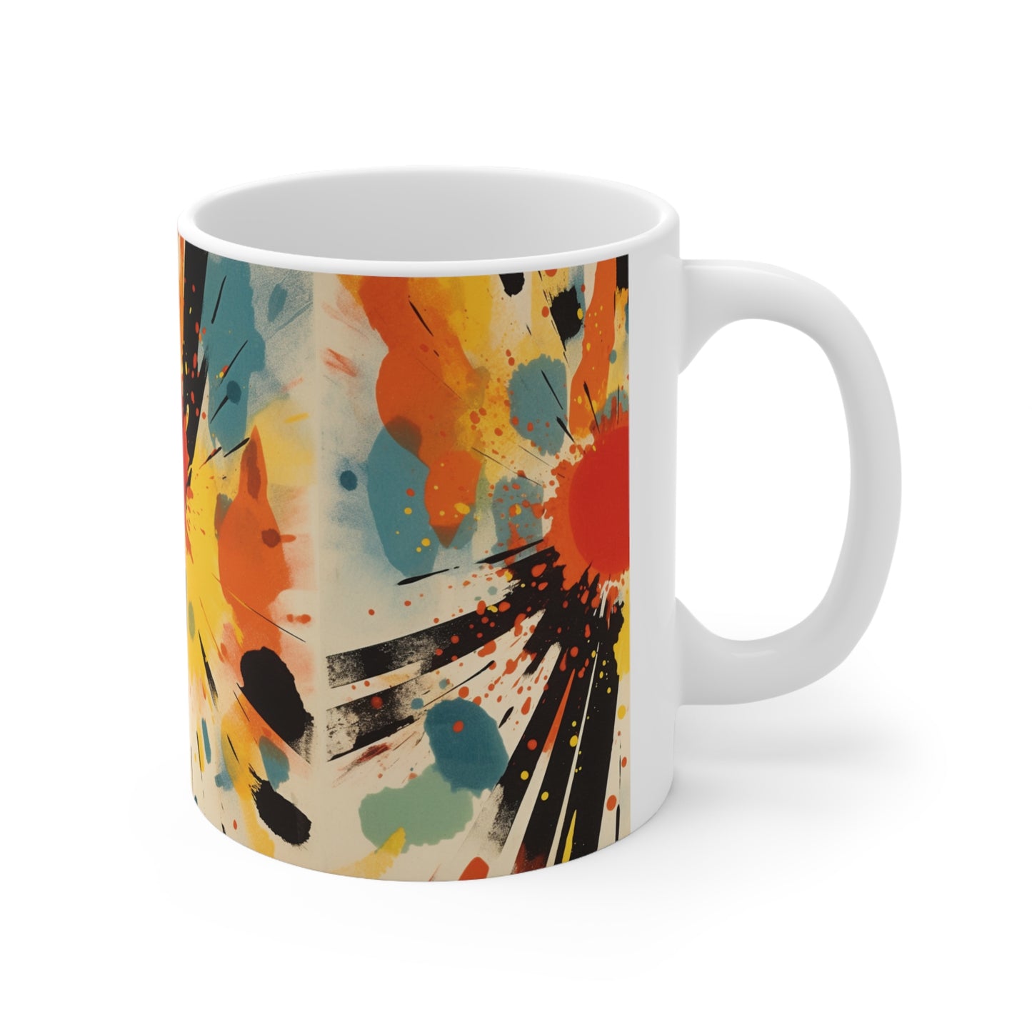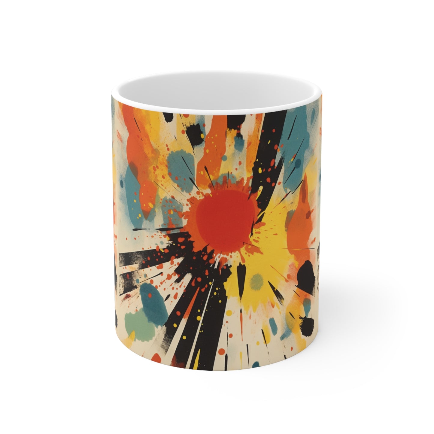 Embrace the celestial beauty of our "Cosmic Burst" Ceramic Mug, where abstract art meets interstellar wonder. This captivating mug features a striking red spot at its center, seemingly exploding with vibrant orange hues radiating around it. Black lines shoot out from the middle, creating an illusion of cosmic motion and energy.