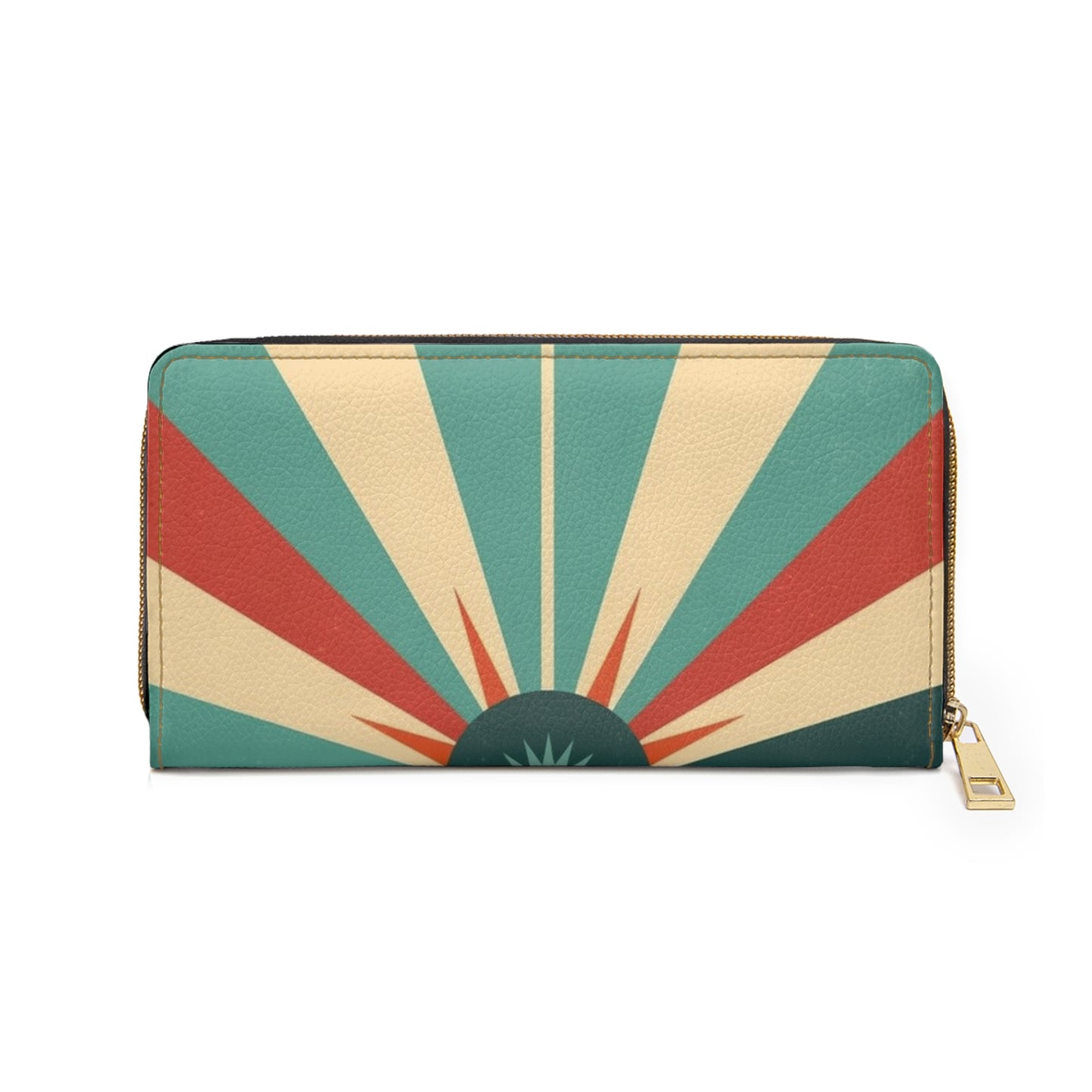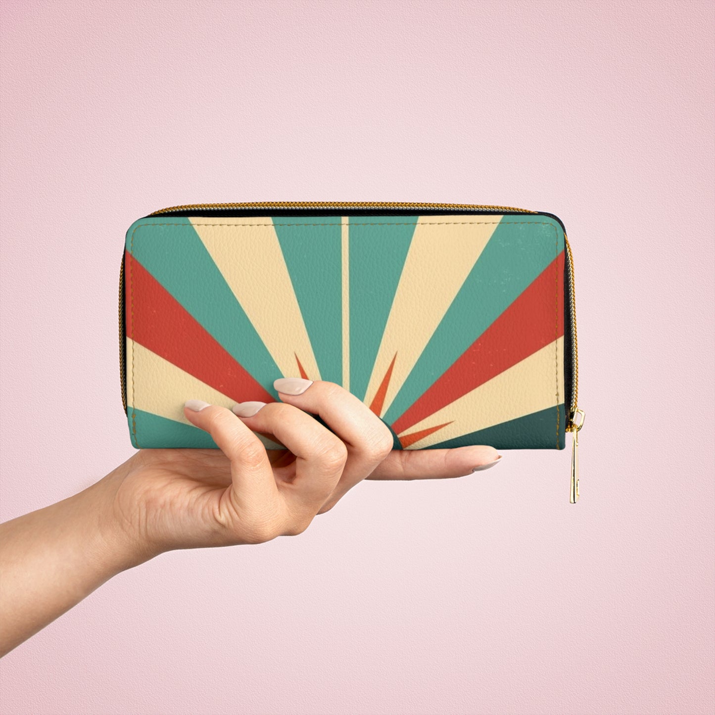 Channel nostalgic vibes and eye-catching design with this 1960s fashion-inspired starburst candy colored zipper wallet. The vibrant shades and playful hues capture the spirit of the era. The wallet provides ample space for your essentials and ensures easy access with a reliable zipper closure. Carry a burst of color while adding a touch of retro style to your everyday life. This wallet is a true testament to fashion and individuality.