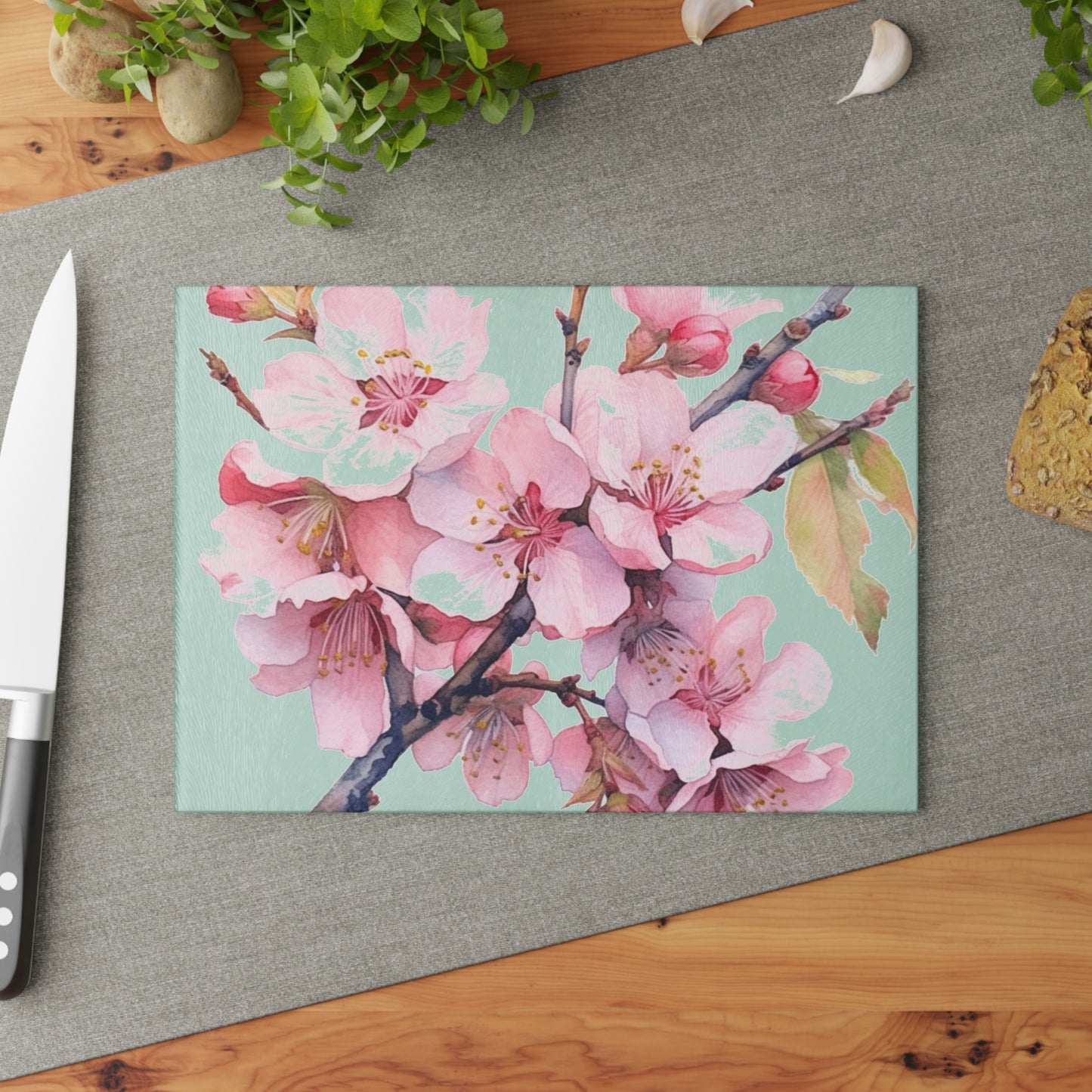 Whimsical Delight: Watercolor Cherry Blossom Tree Glass Cutting Board